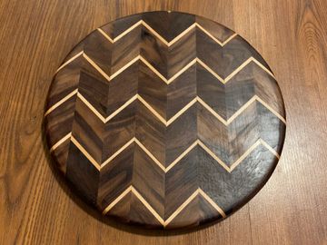 Made from walnut and hard maple Cut into a 12” circle great as a cutting board or serving piece.